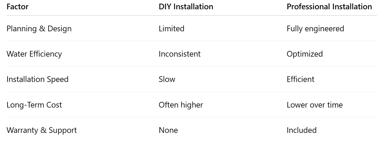 Choosing between DIY and professional installation depends on budget, property size, and long-term goals. While DIY sprinkler systems may appear cost-effective, professional installation consistently delivers better performance, reliability, and efficiency.