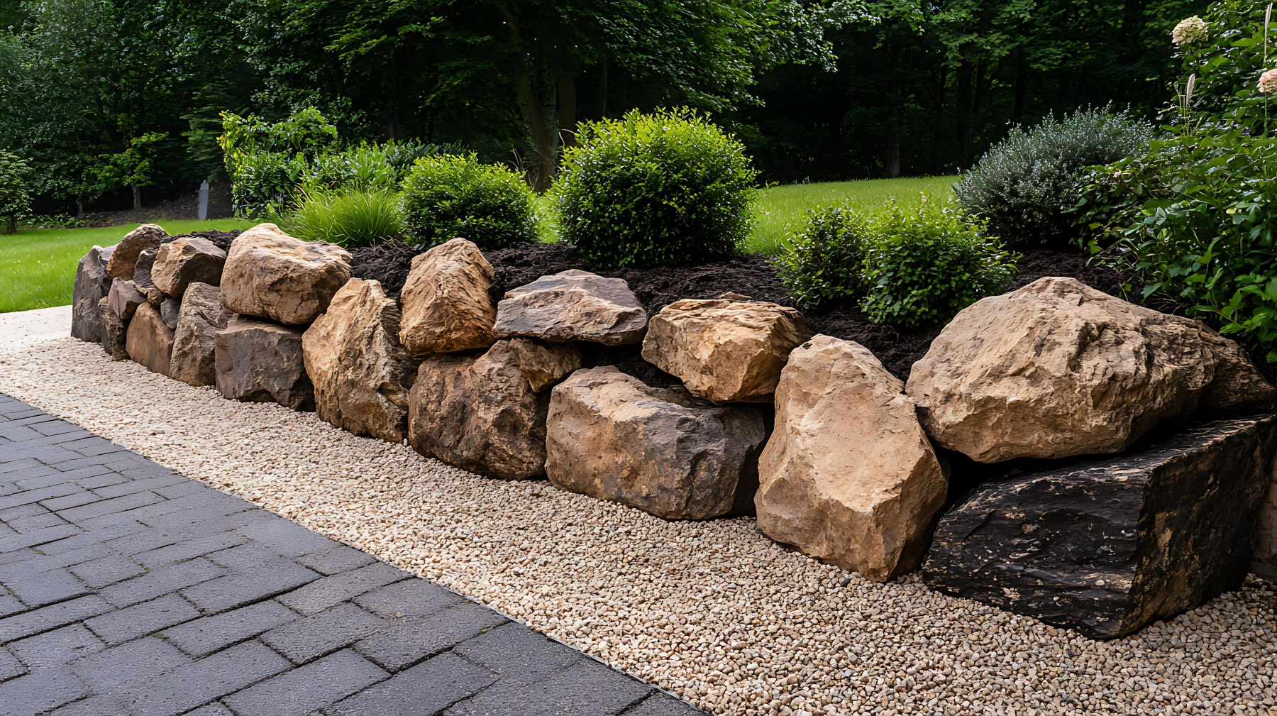 Decorative rock and gravel installations for bed lining, erosion control, and weed suppression.